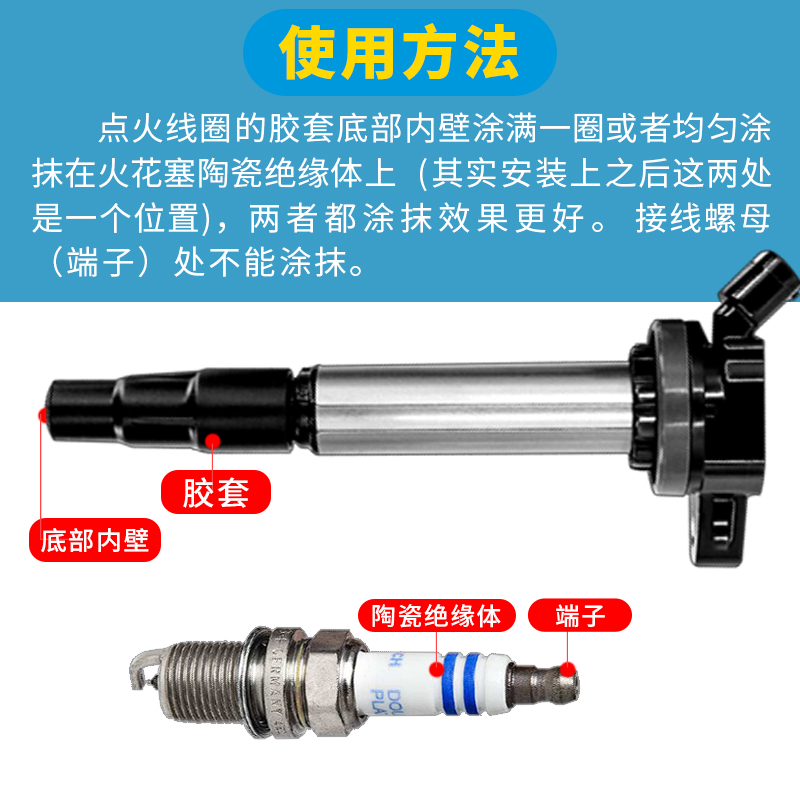 產(chǎn)品應(yīng)用:適用于汽車點(diǎn)火線圈與火花塞陶瓷絕緣體、電接頭等處的絕緣、密封和潤滑。